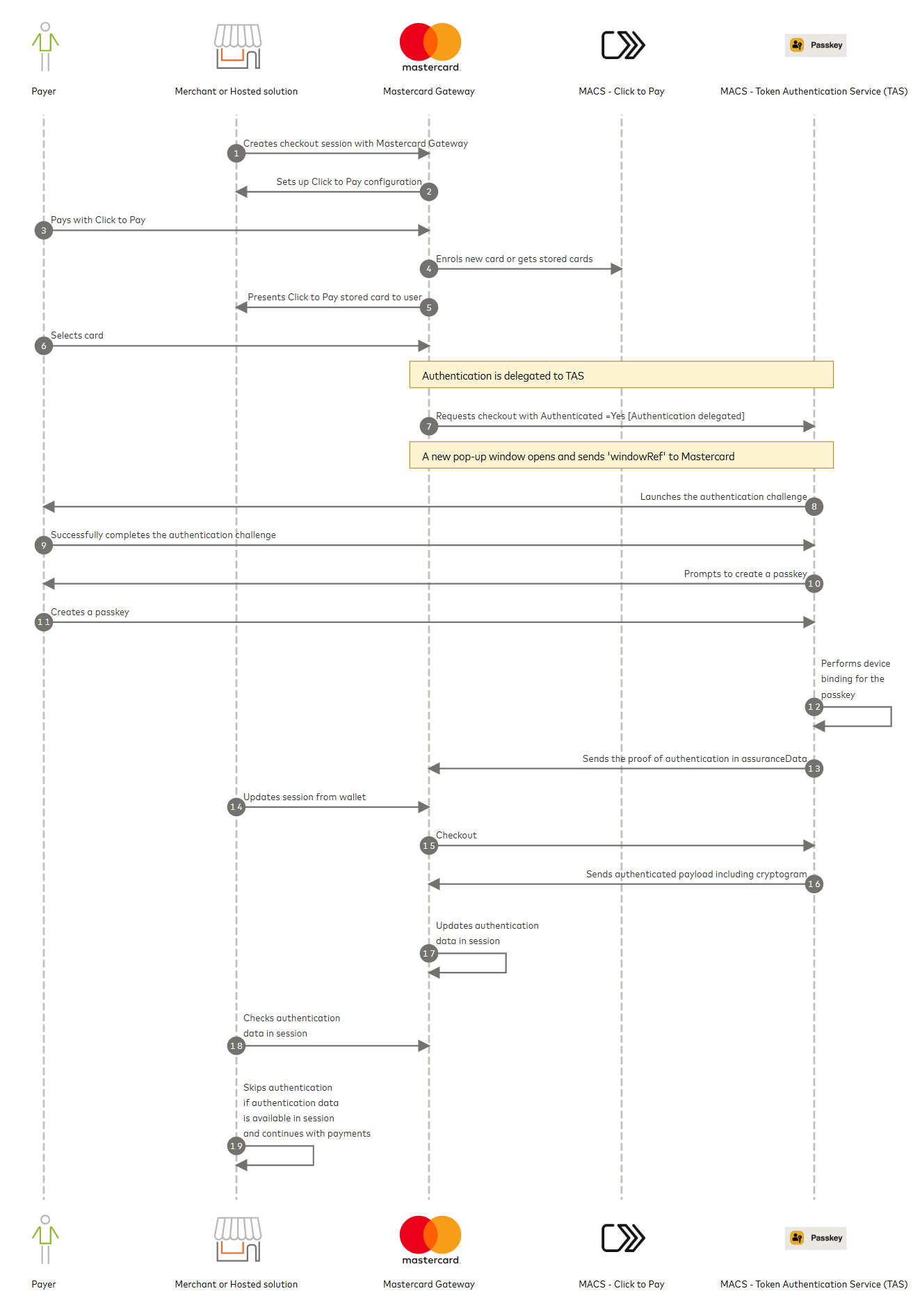 The following diagram illustrates the high-level flow for a passkey creation and a payment where the payer is authenticated using Token Authentication Service (TAS).